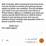 I have been a customer of this site since 2019. Player ID: ******* I replenished the account a lot, partially withdrawn, bet in singles and express. Recently, I began to win more, so once again making a request for withdrawal, I was refused and demanded a "Request for Documents". I sent all the necessary documents, passed the verification. But I received an answer in the mail: