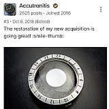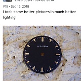 Below, a watch bought by him in mid September 2018 became a watch he claims to have just changed the crystal on it. Images show that a movement he won on ebay on September 17th 2018 ended up in the "original factory" watch in early October 2018.