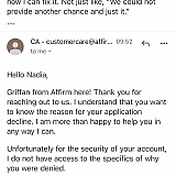 I tried to create an account with Affirm but they responded via email that I can't create an account and they apologized. Also, they mentioned that they couldn't give me another chance haha. Then I asked them what was the mistake that I have made and how I can fix it. After that, the employee responded regarding security policy we could not address the reason. Moreover, I called them several times and asked them questions before declining my account, but the customer services seemed they were not familiar with the system and didn't have enough information; because all the time they asked me please wait for 5 to 6 minutes and then came back with empty handed and still didn't provide enough information. Overall, this company with its policy are totally ridiculous.