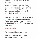 Air bnb decided to cancel my account, before I even got to use it, this is such a joke, I set up an account for air bnb yesterday and paid for our room as soon as payment went thru air bnb cancels my account for being a " potential threat", to air bnb? 7excuse me for having the money to pay for my room? And sending the front and back of my I'd and ssn, seriously this is the worst experience getting a room! We will go somewhere else to find a place to stay and never try using this crappy service and there customer service is worst then ever! We live in USA speak english!