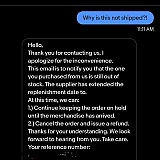 As you can see, they left the replenishment date empty. So no idea how long it'll be. So I ordered another one. At 6:00pm, without confirming I wanted it cancelled they messaged me saying it was shipped!