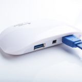 A very streamlined USB 3.0 hub (USB 2.0 compatible) that takes up very little space on the desktop and is great for travel. The dimensions of the hub are 4.5"x2 3/8"x0.75" and weighs only 1.75 ozs. The cable is 23", giving you plenty of options as to where to put the hub.