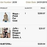Answer: Same things happen to me, they add in the coat Maya- Plaid Fur Coat And until now, none of my stuff i receive. Can we report them to police