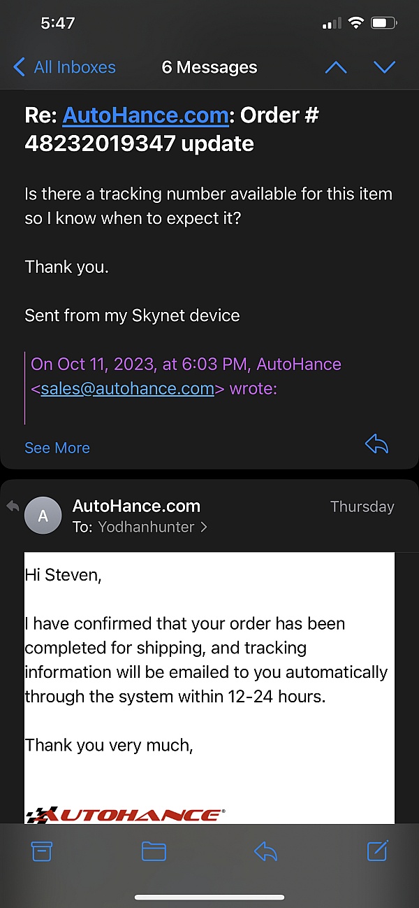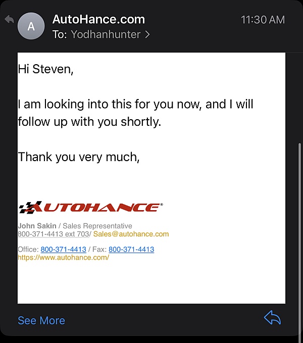 I was shopping for a particular exhaust in the affirm financing network where I discovered Autohance. Sale service was so professional confirming the exhaust was in stock at their facility, I proceeded with my purchase and received my order in three days! Autohance is legit. They're not like their competitors where they trap you in a back order with a lead time of 1-2 months. The exhaust is installed and the product sounds amazing! And with affirm financing allowing me to pay over time, I'd say this was an overall satisfying purchase.
