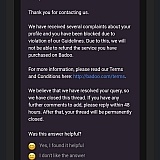 We understand that it can be frustrating to lose access to your Badoo account, however by the sounds of your review it seems as though you have already been in touch and the block was confirmed by multiple moderators. Please note that appropriate action will be taken against any user that violates our Community Guidelines, so please do not worry about the other user in question if they too have been reported to our moderators.