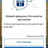 AVOID! After being sent a link by a friend offering 10% off for new customers, I followed the link where it said minimum spend £40 receive 10% off as a reward. No other T&C mentioned or link to any given. After selecting my hotel and room type I saw a note saying 'great choice... receive your reward after we confirm your stay' so I went ahead with my booking... But when I received the conformation I saw the 10% had not come off the advertised price.