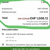 Misleading discount claims. They stated that they would take over 60 francs of the total price of the hotel stay. I even sent them the screenshot but they just gave a standard answer that the cost of the stay was correct.
