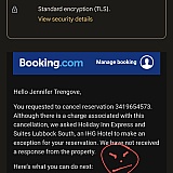 So I call booking back AGAIN. They said they'llsend an email cancellation request to the hotel with a 24-hour deadline. Then booking emailed me saying the hotel never responded and said to call the hotel AGAIN. Are you freaking serious?! If they booked my reservation they should be able to UNBOOK IT, especially in an instance like this when there are 2 locations with the SAME NAME. But NOOOOOOO, corporate Americas gonna do whatever it wants as long as they get their money.