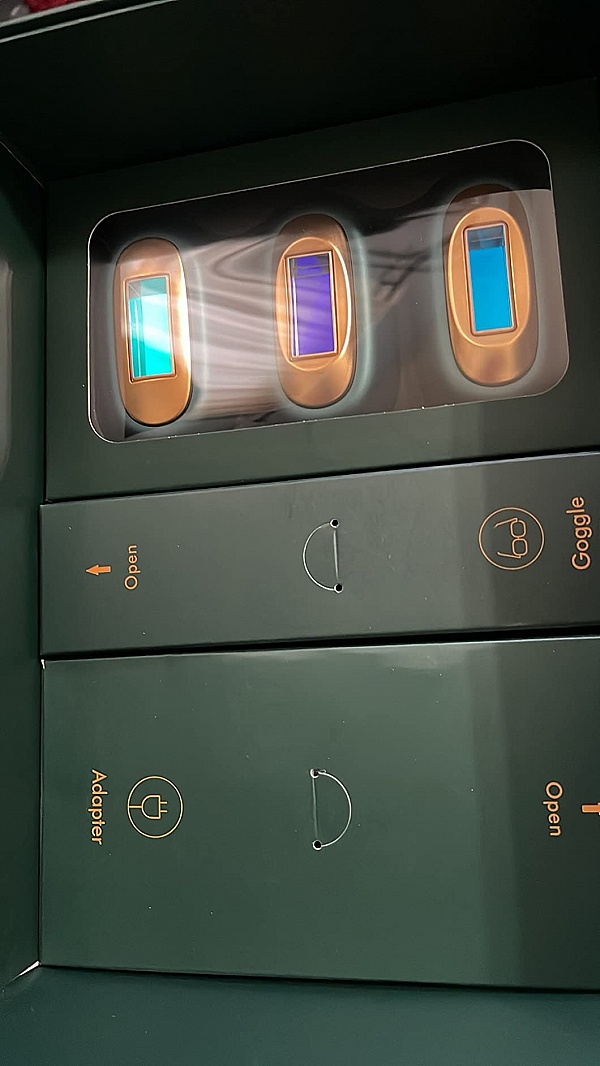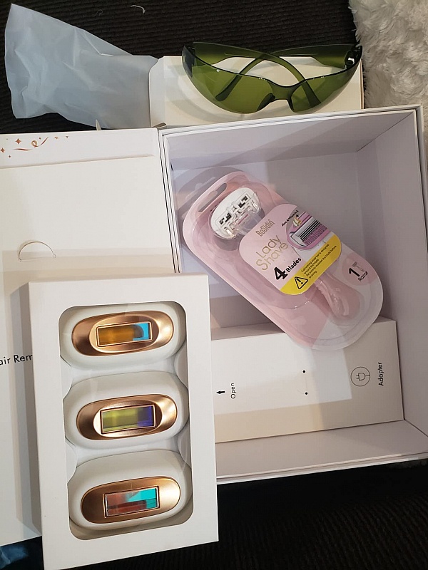 I've not ever owned anything like this before, so I was intrigued to get my hands on this product. I've only done two treatments thus far and haven't noticed much of a difference yet, but this is a product you must be consistent to use. So, hopefully I'll start to notice less to no growth in the next few weeks. But this product comes with everything you'd need to get started. Even goggles to protect your eyes and a two pack of Venus razors which I was surprised to find as it didn't mention anywhere that it came with such. The packaging was also beautiful. I got the green epilator. It's really pretty.