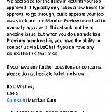 After care.com publicly posted this comment below to "resolve this issue". This is simply not true. I have responded and reached out to them several times and every time they take no responsibility, refuse to make any attempt to repair to basically stealing my money and not delivering. Check out their profile out on the BBB website for 732 complaints in the last 3 years as of today.