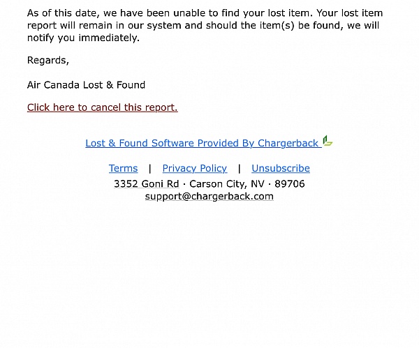 Chargerback is a software company used by Air Canada to help manage their lost and found. While our software accepts lost reports, sends notifications and accepts payment for the shipping of left behind items, our staff is not on site, we do not ever physically handle the items or have a say in their status. Those duties belong to our partners such as Air Canada.