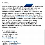 I recieved an email tonight stating they wokt refund my money because the tag was shredded, the pants smelled of mold and the outside tag appeared to have been wet.