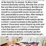 I ordered a birthday gift for my husband on 10 December 2019. On 21 January 2020 I still didnt receive it. Clearly it was gone. I tried to get them either to locate it or to resend by DHL or a similar service. They refused. They spoke nicely but zero help. I asked for the refund which they said they agreed to (oh thanks you're willing to pay me back for the product you never gave me?) but I have yet to see the account being credited. What's worse is that I receive their spam asking me if the recipient liked my gift: no my husband never saw the gift. But the cherry on top of the cake is that they delete bad reviews and block you from social media. Good reviews not to be trusted.