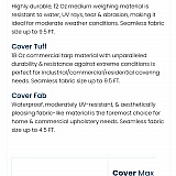 Highly durable, 12 Oz medium weighing material is resistant to water, UV rays, tear & abrasion, making it ideal for moderate weather conditions. Seamless fabric size up to 9.5 FT.
