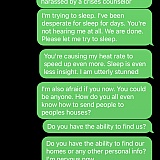 I texted after many nights of not sleeping. After a while I realized that it really wasn't going to do a whole lot for me and I just wanted to stop and try to sleep. I said as much but Sean insisted that I was in a crises. He refused to listen to my pleas. I did not indicate that I'd kill myself. I did not indicate that I was suffering a medical emergency other than lack of sleep. I made it clear I wanted to get off the line and go to sleep. That's it. Sean wouldn't let it go. Then the police arrived and left because I was not in need of intervention of any kind. After which, I started talking to someone else on the live because I honestly felt really harassed and nervous about the whole thing. I wanted to lodge a complaint. Idk. I have no way of proving this but I think it's all one person. I don't think there are supervisors to actually help. I think it's just one moron giving themselves multiple names. I didn't sleep. I feel far worse now.