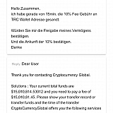 Sehr geehrte Nutzer, ich habe mit Crypteria Wallet - Trust Wallet und Moduli Network 200k verloren. Mir hat man weiss gemacht, meine eingefrorene Guthaben Assets von CryptoCurrencyGlogal zurück zuholen. Alles Bull$#*! All heir genannten Anbieter betrügen und Belügen die Investoren. Angebliche Broker wollen beim Traden helfen, jedes Trade ein voller Erfolg. Die Brocker verlangen immer höheres Eigenkapital ansonsten schliessen Sie dich aus der Layout Gruppe.: " Mein Broker hiess Manisch Auora! Heute bin ich alles los. Und Niemand schützt uns vor Cyber Crime. Ob Binance, Kraken, TrustWallet oder Bit Panda haben keine Sicherheits Prüfung mechanismen und übertragen dein Guthaben auf die Betrüger Trading Seiten. Ich bin am Ende und bin kurz vor Pleite. Alles an mein Vermögen habe ich investiert und habe heute nichts mehr. Ich kann nur davor warnen lasst die Finger davon. Mein Aktuelles Guthaben *******K sind von CryptoCurrencyGlobal eingefroren und verlangen je Monat 10% Gebühren. Maximal warten Sie 3 Monate und danach Spenden Angeblich Sie es ein RED Cross. Ich habe gebeten von den *******K die 10% fee zu entnehmen. Nein das tun sie nicht weil das nur eine vor gegaukelte Summe Guthaben ist. Sie wollen frisches Geld. Was ja Unsinn ist. Heute bin ich Klüger und 1500K Ärmer. Haus Verkauft, Kredite aufgenommen und alles was sonst noch da war habe ich verkauft um in die 1500K auf genommen zu werden. Zudem hat mich eine Frau die Liebe des Lebens vorgespielt. Alles nur Lügen. Bitte verlieren Sie nicht Ihr Leben wegen solchen Verbrechern / innen.