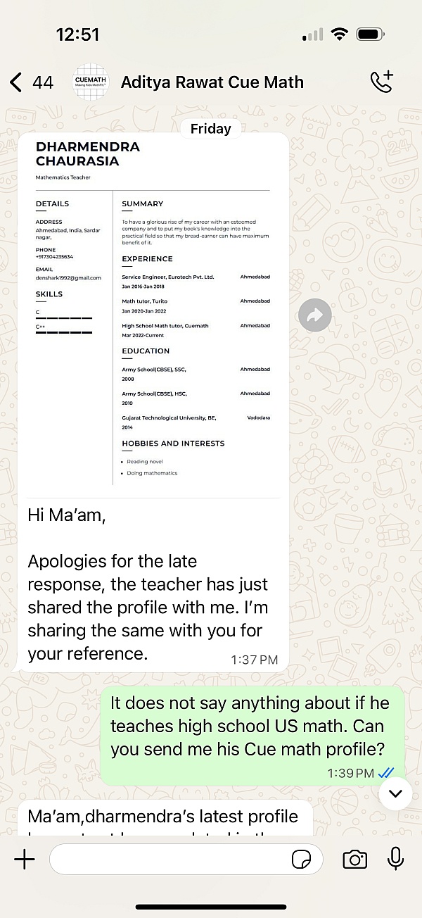 The course and teaching methodology is the best at cuemath. The teacher who takes the classes are on time and very efficient. They are very dedicated and try to cover up topics where there is maximum learning gaps to be met.