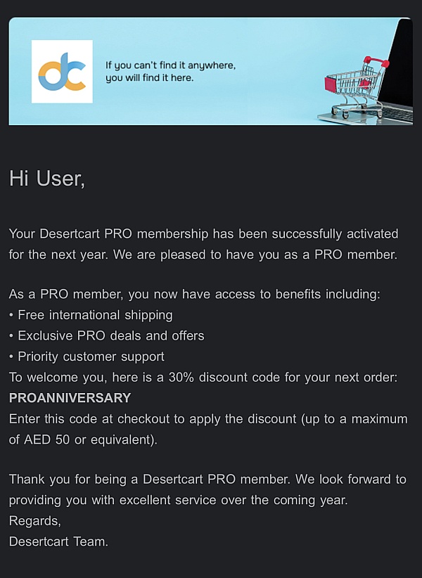 I purchased an item form desert cart and somehow desert cart sneakily signed me up to an annual membership which costs 699 dirhams. They do this by offering you free shipping but the catch is that you are signed up to this PRO membership. I'm usually very wary about such things but it even caught me out. They down right refuse to refund as soon as they have your money, that's it. This scheme with desert cart isn't one I have heard of yet so sharing it here to help others out.