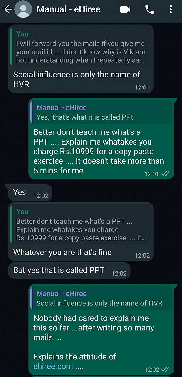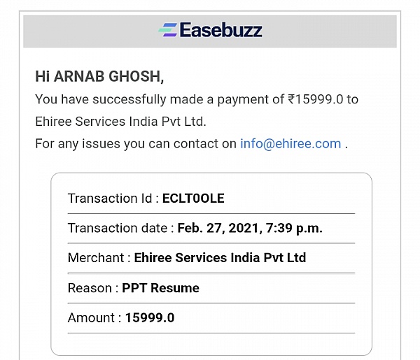 I was received call from ehiree related to some services that guys offered at that time i was blank its doubtful for me because i was receive call continuously from other portal as well but charges are vary each of them, that was first point which blink in my mind why price differ services same some of them, give job guarantee... I am not fool here without interview how can be possible getting job, don't want to share name of portal but NERVER TRUST blindly only they are advertising or promoting always take time for best one chosen. For me i go with ehiree not for price but they are not giving any fake commitment all depends on my profile experience and market trend they offered.So, I was paid for the services as I had never availed any such service in past.