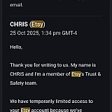Unjustified Permanent Suspension Without Explanation Immediately after my very first sale, my Etsy shop Atelier Drachenfunke was permanently suspended. At first, I received no explanation at all – only a message that my account was closed forever and could not be restored. I filed an appeal right away. After 2–3 days, I received a reply from Hazel saying the decision could not be undone. Later, she added a vague comment that I had supposedly violated Etsy's policies. However, no specific rule or action was mentioned. To this day, I have never been told what exactly I did wrong. I know I did nothing against their policies, yet I lost my shop without reason. For a small creator working with handmade woodburning art, this is devastating. Etsy is an important platform for handmade products, but instead of support or transparency, I was left without any chance to defend myself. This feels unfair and arbitrary. I am now forced to look for alternatives, but I want to warn others: your shop and work can disappear overnight, even after your very first sale, and you might never get a clear explanation.
