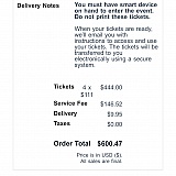 Edit 10/26 - The tickets were delivered via the delivery method defined with the tickets purchased. FedEx delivered the tickets 3 times and the customer was unavailable to receive them. This issue has since been resolved with the customer.