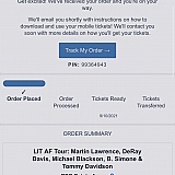 On 9/9/21 I bought tickets to a comedy show scheduled for Friday, 10/22/21. I got an email that order was processed with an estimated date of tickets being ready on 9/10. That never happened.
