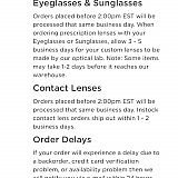 I ordered sunglasses on January 17,2019. I received a confirmation email telling me they received my order but did not receive an email telling me when I should receive them. I've been calling and emailing them and no response. The 800# says they are closed at 3:30 pm CDT on a Monday. I still have not received an email from them confirming shipping details. It says "order is being processed " after 2 weeks. Wow! No more business with this company. Do not buy. It's a scam. I will be disputing charges with my bank. The photo is their shipping policy, which is totally bogus!