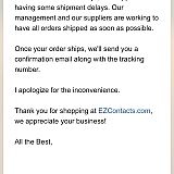 Couple of my frames were back ordered that Galvin provided me an update and was able to provide an expedited service for a different color. EzContacts clearly do a great job in terms of both frames and contacts. Contacts are cheapest I find it any where else that is reliable and genuine.