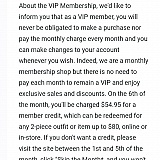 Thank you for taking the time to provide us with your thoughts on the VIP Membership. We are continuously striving to satisfy our customer's needs as much as possible. Our Member Services Team will get in touch with you right away.
