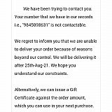 "Please be informed that the order is returned and we cannot make the redelivery before rakhi as it is 21st today. Please let us know if we can arrange the delivery.