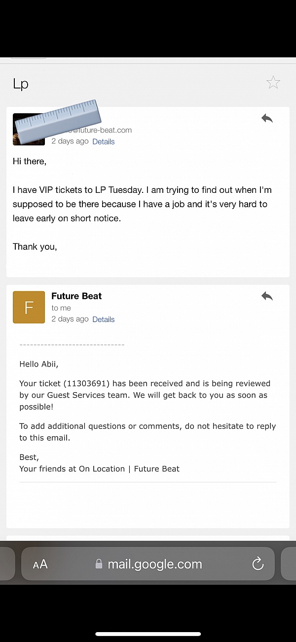 In the future, I would rather miss out on a VIP experience than deal with these people. I have not heard back from them and my show is on Tuesday. Today is Thursday. I have a job, and the show is literally on a week day during a time people work I have been trying to find out when so THAT I CAN TAKE TIME OFF. BUT IT IS LITERALLY THURSDAY AND PROBABLY TOO LATE FOR ME. TERRIBLE CUSTOMER SERVICE. AWFUL.