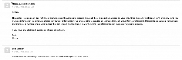 Bought Melissa Etheridge tickets with Photo Op Package December 2021 for an April concert as a Christmas gift for my girlfriend. Package added $400 to the cost of the tickets ($640 total) but included the photo opp with Melissa, T-shirts, autographed poster and bunch of other stuff. Very cool. We both have loved Melissa since the early 90's. We were so excited! Got an email with a redemption code for t-shirt sizes in March 2022... redeemed both codes right away. The emails said that the merchandise might arrive after the concert. No big whoop. A few days before the concert in April, she tested positive for Covid. The day of the concert, I was still testing negative, but I knew I had been exposed. We both chose to do the right thing and not put Melissa or other concert goers at risk. We missed the photo op and the concert. Last week, I still had no word on the merchandise. I wrote Future Beat - there is no way to contact them except for *******@future-beat.com - clue that they are probably a very bad organization. Got a note back from support saying they were processing my order and would send me tracking when my order was shipped but they couldn't give me any idea when my order would ship. Processing can take "many many weeks". They had my money for six months. The concert was a month before I reached out to them and thats the best they could do. I have continued to write them and they are unresponsive. How is that anything more than a scam? They get to have my $400 and deliver on what I purchased whenever they want or never? I am now in contact with Melissa's fan liaison who says she is contact with Melissa's management team. On Monday, I will file a fraud claim with my bank and reach out to the CA attorney general, as the company is in CA. Really really gross.