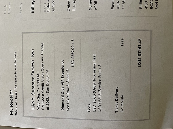 I purchase 3 VIP Experience tickets for the Lany show through #ticketmaster #lany #futurebeats #vip there was no instructions on when to arrive and what to expect I had to call #calcoastampitheatre for instructions. First of let me preface with we absolutely love Lany (great concert) other than what we paid for with the VIP Experience (which was absolutely horrible) we got to the venue of which we were the last ones in and we got a stupid T-shirt and a laminate (which does nothing at all) oh and a cd, no signed poster and they took group picture which we still don't have. We were supposed to actually meet and greet (never happened) after 40 mins we were told to leave the stadium (never got the opportunity to purchase merch) the young lady who was in charge should never of been employed for this company (she made things so much worse) so we had to leave and stay out in the sun for another 75 mins or which we had to go back in line for another security search (wtf) I've emailed Ticketmaster which basically told me sorry not so sorry blamed it on the venue. Called the venue they explained the process of who is at fault. So it is between the BAND (who I don't even think knows this $#*! goes on with their fans) and future beats fan experience. Listen I've been through live nation and their experiences (which are awesome) but hands down this was the absolute worst VIP Experience I've ever paid for. These tickets were gifts to grown $#*! kid and his girlfriend because this was their favorite band. Which left us with a bad taste in our mouths.