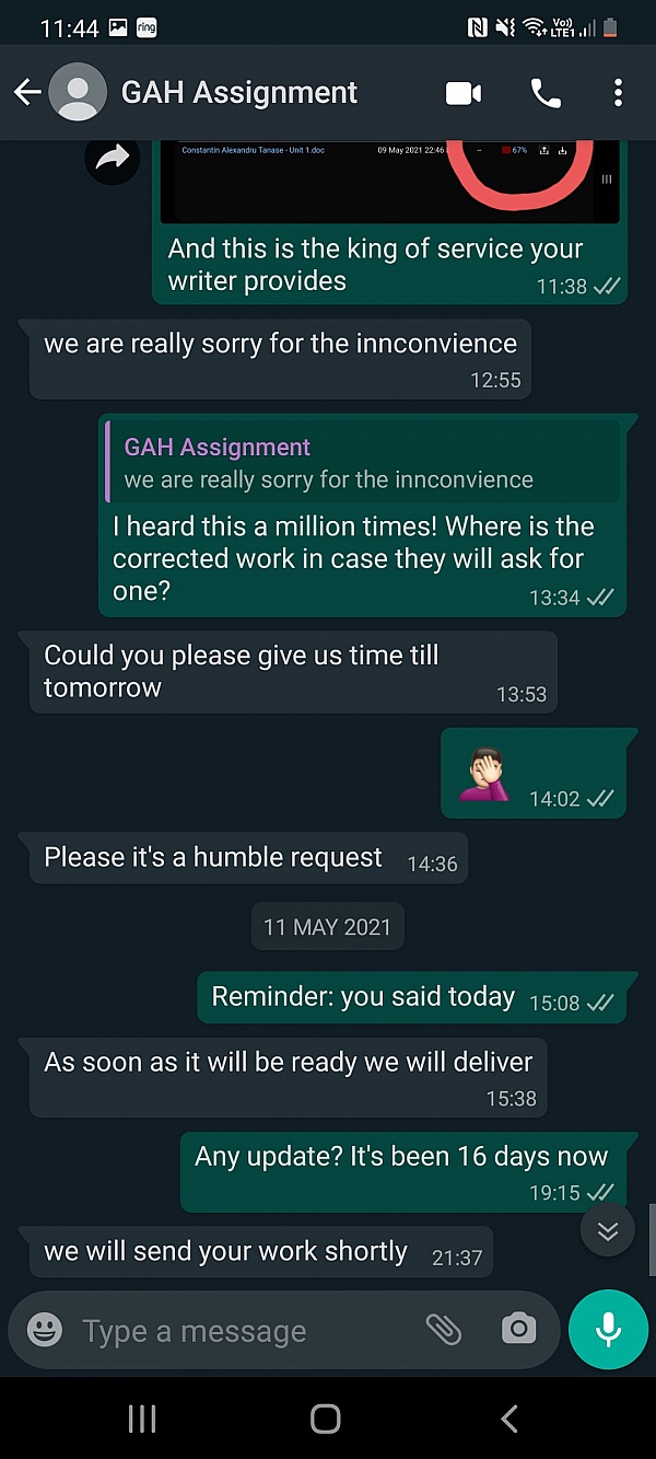 I made the mistake to contact this company for help every time I ended up paying money for nothing i had no choice to do the work myself. When I received the word and I went for feedback to the teacher I embarrassed my self with the assignment they send me because the assignment brief was not followed. I even had many sentences without a verb. When was asked to analyse they just write little description. I contact and I send the assignment with teacher comments received it almost the same they just added a few non sense sentences. Honestly it's time and money wasted for nothing. Reference missing and not done as I asked for Harvard style. And the second time they just copied from someone else's assignment and added to my assignment as pictures. This people they just take us for fools. I don't recommend. There are other possibilities for proper help for the assignments.