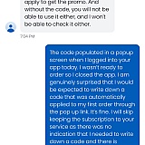 I was offered a $25 credit for the $20 promotion I used, but the credit was not applicable to the items I originally ordered. The credit required a minimum cart value of $50 and could not be applied to tobacco or alcohol, which were the only items in my order. The original promo code did not apply to liquor but did to tobacco, making the credit useless for me.