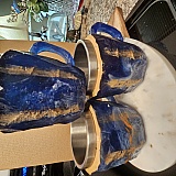 These mugs are made of hard plastic and painted blue, super cheap looking. These are a total scam, do not buy. The picture shows a quartz/mineral rock mug exterior not plastic.Said they could only return $ 10.00. I ordered 3@ $49.95. What a lesson. I took a total loss. Please don't buy anything from this seller.