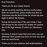 Ordered for valentine's day roses and chocolates for the 14th of February 2024. The delivery did not occur even after trying to call them and email them. Customer service has ignored all my messages and use the dane message over and over again. They have been slow, inadequate, subpar and downright horrible.