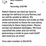 My flower bouquet order ******* that I placed on May 9,2020 was never delivered to my mom on Mother's day! She waited all day long! I called the customer service number numerous times and got no answer only automated answering machine. Finally two days later I received an email from Just flowers stating they were unable to deliver my order and they cancelled my order. Well it's May 13,2020 and no refund yet! Oh but how quick they were to charge card in the same day my order was placed! I'm so angry! This is so wrong what Just flowers is doing to so many people! I want my money back!