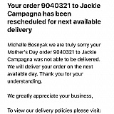 Michelle Bosnyak we are writing to inform you that your order 9040321 to Jackie Campagna has been cancelled, and if you were charged, your account will be credited. The credit will take 1-4 business days to appear on your charge account. If you have any questions please do not hesitate to contact us by either replying to this email or by calling us.