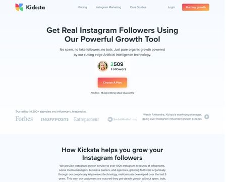 Kicksta has helped over 100,000 clients grow their Instagram audience. Our AI-powered technology is trusted by some of the biggest influencers, brands, marketers, and agencies to deliver more sales and more engagement than any other Instagram growth service. With over 8 years in service, Kicksta is the global leader in growing genuine Instagram audiences without spam, bots, or fake accounts.
