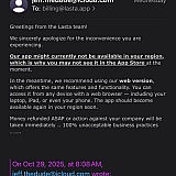 Signed up for one of their Tai Chi app and paid $13.62, congratulatory email informed me the app wasn't available in my region or country. So paid money for a non existent app. Forever looping trying to get a refund and to cancel a subscription that also wasn't included on the website signup. A complete nightmare. Now they say my subscription is cancelled but no refund also not included on their website application information signup page. On top of that now reading and hearing this company will quite possibly continue to debit my account for more funds at which time they will not be reachable in any way shape or form whatsoever. I will change my accounts to prevent further loss of funds by these SCAMMERS. Waiting now to see for this to happen. The head office supposedly is in Miami but also operates in or from Poland. And if so I will have my contacts in the FBI, FEDERAL MARSHAL OFFICE, INTERPOL, ABW, KGP, SCS, GIIF, AND THE IRS dispatched to each of their locations of business for inspection and investigation. Also release public looping posts about this company on every social media platform so everyone's feed will see it every time they open their media outlets. In the event of disappearing and popping up as a new company with different names that to has already been addressed. In addition the App Store's have been notified of this company's fraudulent practices and already pulled their apps from their content which is why LASTA INC. now is obtaining subscription's through its website. The end game is to completely shut these people down for their misleading fraudulent conduct and practices … beware of this company and their products, they suck you in with a high discounted price and then continue to debit your accounts with you having no means of a refund though a discontinuing your contact with them. They will either send you on a continuous loop between the app, the website and emails without any result or they just will not respond to your requests though any medium. BEWARE BEWARE BEWARE … 🤬😡🤬😡🤬😡