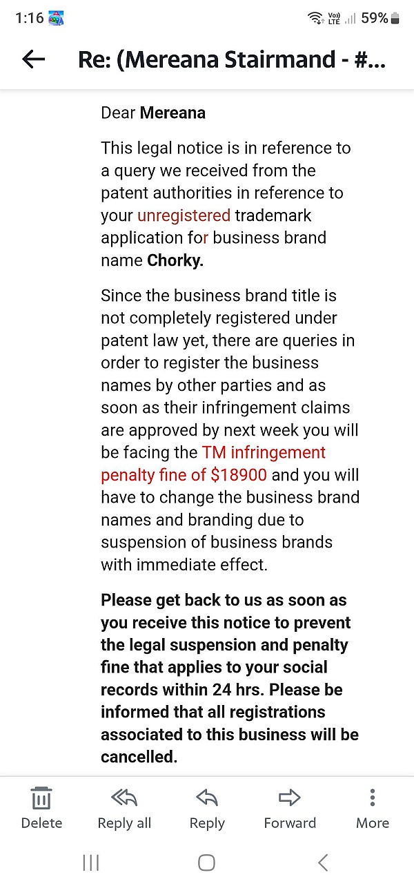 After reading some of the warnings I. The review, I noticed that one happy client with a bnb paid a lot of money fro trademark. Let me repeat... the client got toasted with a trademark just for a bnb BnB. This company has one intention, that is to find gulable people, scare them and take money. They use words such as " you need to to do this as soon as possible" and create a matter of urgency.