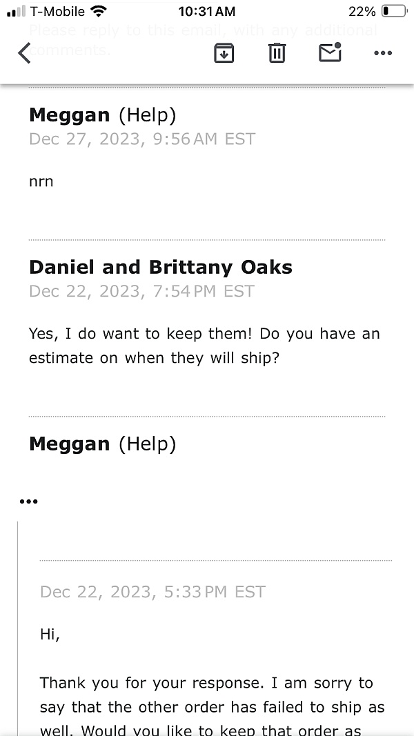 On 12/15/23 I sent an email to follow-up on the status of my order - no response. On 12/18/23 tried to chat with customer service, but chat feature unavailable. So I sent another message thru the site. This morning, 12/19/23, I tried calling customer service during their operating hours and the line went straight to voicemail, which sounded like someone's personal phone rather than a company answering system.