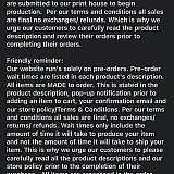 This is a terrible business. Ordered two items almost two years ago now and received no concrete answer beyond "pre-orders take time to manufacture" and "we expect delays." Their compensation was sending one part of the order early and nothing else. No solutions from customer care offered. Emailing them for months to no avail. Thank god I used paypal to pay for this, at least they had the decency of investigating it because the company did not respond to me until the six month leniency was up. This company must be scamming many people by waiting until it's too late to request a refund. Thanks for your help paypal.