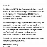 It is clear on their summary that they have overbilled on thec3 monthly payments and for two auto deliveries that were not ordered, expected or delivered. They are shisters. Do not order from them, do not give your credit card info to them and believe the awful reviews they've gotten, they are true. I have all paperwork and back up documents to prove everything. What an unethical, immoral, dishonest company. They should not be in business, they should be shut down.
