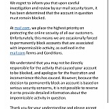 Please note that this is a decision made by our abuse department and we do not have further information we can provide to you."