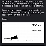 I purchased two pants on November 2022 in addition to other products in the same order. My usual size is M and the two pants were in size M. I did not bothered to check size by taking a trial if the items when it got delivered on November/December 2022. On top of that I was on vacation on December, so did not have the time to check and in my mind they were size M, so it should be fine. But when I get to wear the pants a few days back February 2023, it occurred to me that one of the pant is fitting and one is not even thought they both are of same size. By this time the return window of 30 days is closed and I reached Mango customer service by email. They are just instructing me to generate the return code from the website even though I am explaining on repeat that the return option will not show up for me as the return has been ended. They will responding the same over and over again and will not help me. Please beware of the size of the Mango clothing items. Make sure you check and trial them if you order anything from them within the return window because the size doesn't match as they describe it on their website. I am attaching my email conversion with Mango to proof how they treated me even though I had been a long term customer of them. I will keep in mind never to purchase from this website as I did not receive proper help and assistance as I expected. Very disappointing.