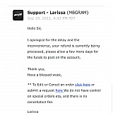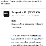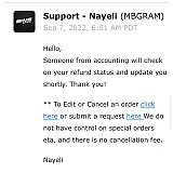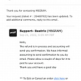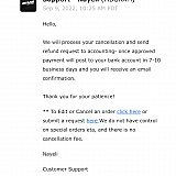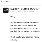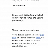 Email screenshot below is after I was told I'd get a refund within 7-10 business days. 10 bus. Days passed and no refund. So I emailed and they said "someone from accounting would be with you shortly". I waited over 24 hrs and nothing, so I followed up asking "what does shortly mean?". Background to the exchange in the screenshot. They just reply with the same canned responses and nobody from "accounting" gets back to you. Nobody ever got back to me.