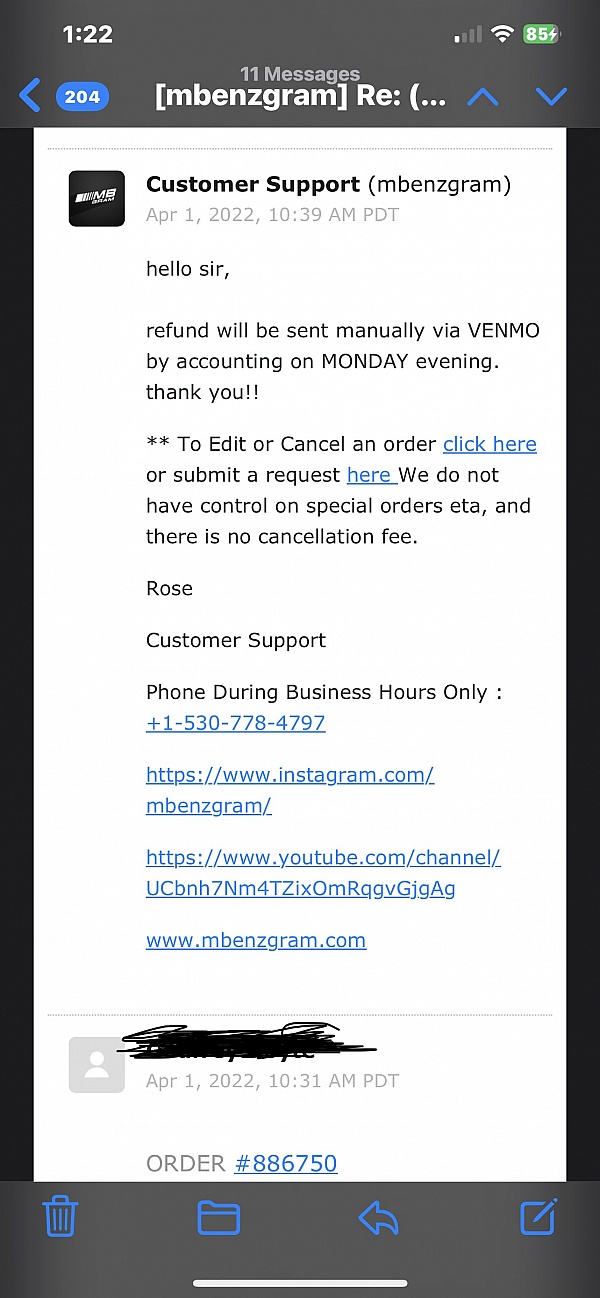 Then, I was told since it was over 7 months since I originally paid for the part, they would have to send me my refund through Venmo. I still have not received a refund for the money I paid over a year and a half ago. Now, they won't even answer my emails or answer their own phone, which I have called over 20 times. I am now getting a lawyer.