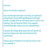 This experience had been hell on earth. Dec 6 I purchased two dress for new years options. The week before news, I reached out asking about when things would be shipped as I hadn't received anything. They explain to me they're still making one of the dresses and to be patient. A little annoyed, I bought a new years dress from elsewhere. Two weeks later I ask what is going on, they say they'll ship one of my dresses. Jan 16 I finally get both of my dresses. I open it up, the one that's made of sequins is falling apart. Sequins all over my bedroom floor and bathroom and threads hanging off. The second dress is two snug such is strange since they're both the same size. I reach out for a refund request, they state to me that the first dress they can give me a 60% gift card and the second dress I should "give to a friend"or take a 60% gift card "because it's a sale item"….l've sent pictures, they admit that they see the issue with my dress and still are refusing to give me what I'm owed. I'm already talking to the Federal Trade Commission but this is so frustrating DONT BUY HERE. Go to Miss Circle, at least they're in the US and honor their return policies.